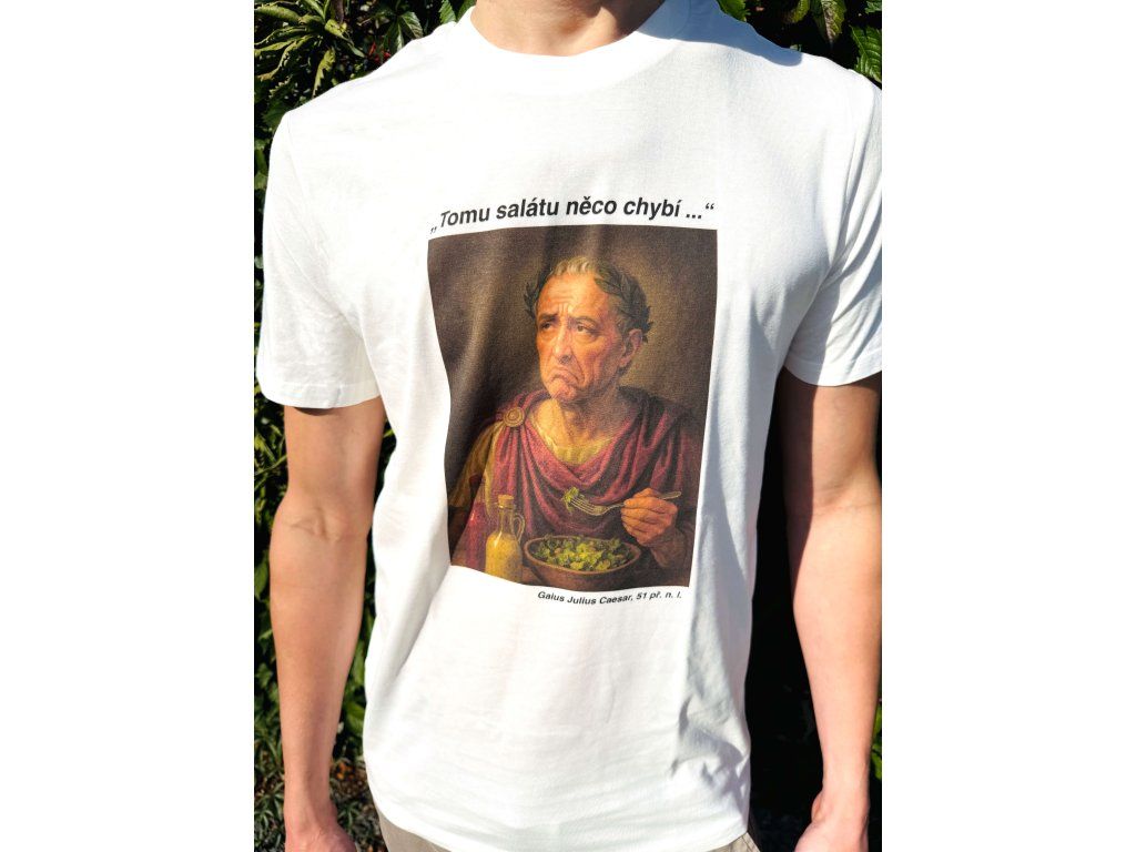 Tričko je proto malou nadsázkou: spojení legendárního vládce s legendárním jídlem. Protože přiznejme si – kdyby měl Julius Caesar možnost ochutnat Caesar salát, určitě by si nechal přidat parmezán a krutony. Veni, vidi… veggie.“